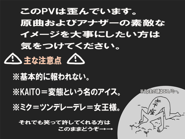 ②は超ドエス展開。でも案外このPVでミクはつれないだけでドエスな面ってない気がして違和感が。いつもカイトが何かやって、それに対して怒っているわけであって、自主的にカイトをいじめるってないんだよね