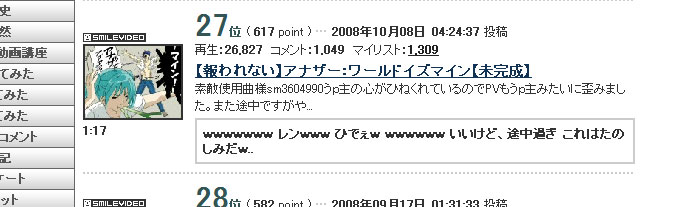 ランキング、デイリーの再生が52位、マイリストでは27位でした。