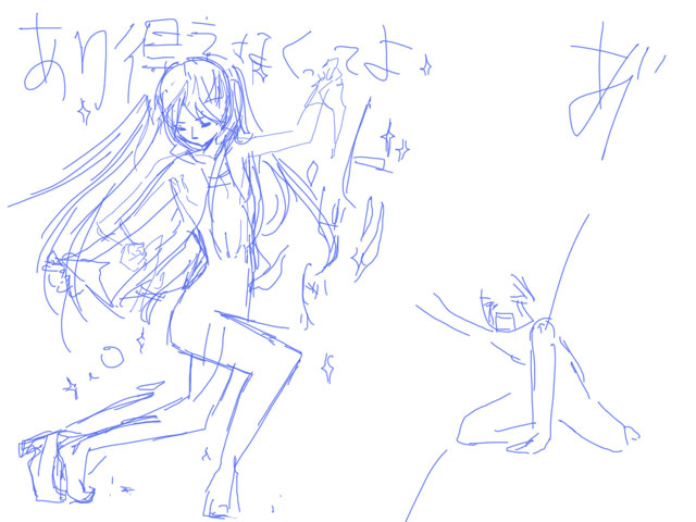 最後のミクのポーズはどうしようと悩んで布団に入ったら浮かんだのでメモになぐりがいたポーズ。
